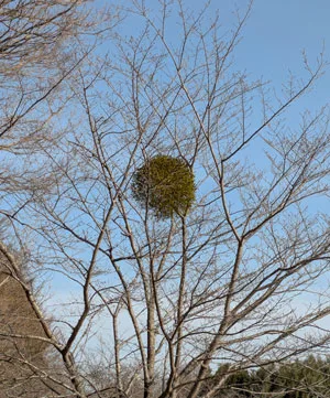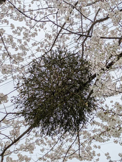 Since then, I’ve always been looking for mistletoe on the trees when I’m out. Here it is with cherry blossoms: