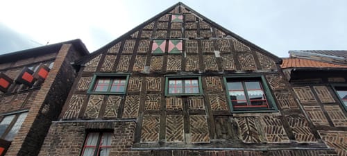 In German both styles are referred to as “Fachwerk” = “shelf/ cubicle work”. And one of the cubicles on the facade had this interesting pattern.