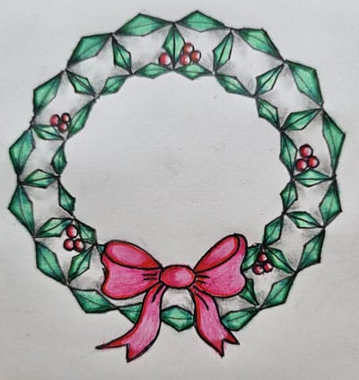 Maryland CZT Barbara Duel Johnson’s Ladderlie is an easy grid or ribbon-style tangle that can be dressed up with color for the holiday season.