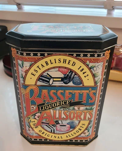 UPDATE: It seems my example of OHO reminded some of us of Bassett’s Licorice Allsorts (unintentional on my part), so I thought I’d share these photos. I purchased this commemorative tin many years ago at Christmas from Publix in Fort Lauderdale. The Allsorts are long gone of course but the tin now serves as our Tea Caddy, full of Barry’s Irish Breakfast Tea.